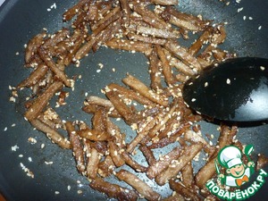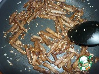 Обжариваем мясо в кунжуте до румяности 5-7 мин, выдавливаем 1 зубок чеснока, перемешиваем. Снимаем с огня. |