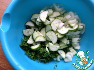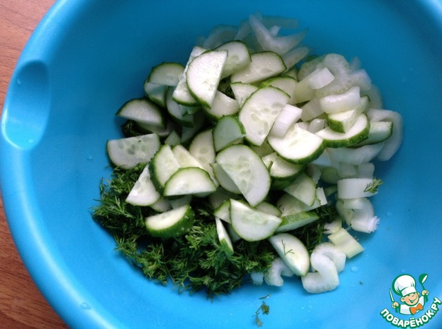 Огурцы нарезать полу кольцами, сельдерей нашинковать кубиком, укроп мелко нашинковать.