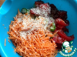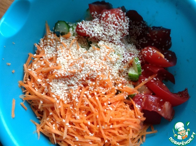 Помидор нарезать крупным кубиком, добавить кунжут и специи. Морковь натереть на крупной терке ( я воспользовалась теркой для корейской моркови).