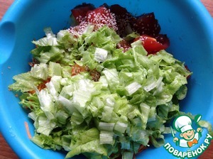 Салат нарвать руками или нарезать произвольно. Добавить оливкового масла и салат аккуратно перемешать.