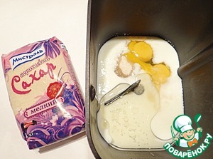 Тесто я замешиваю с помощью хлебопечки. В ведерко наливаю теплое молоко и йогурт, добавляю коричневый сахар, растительное масло, соль, яйца, ванилин.