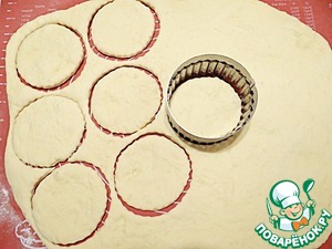 Используя муку для подпыла, раскатываю тесто толщиной около 7-8 мм. Вырезаю кружочки с помощью вырубки (диаметр моей вырубки 10 см).