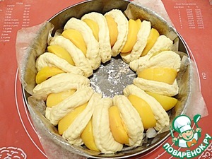 Круглую форму (диаметр моей формы 26 см) выкладываю пергаментом, смазываю растительным маслом). Выкладываю на стол стопкой: кружочек теста - половинка персика - кружочек теста – половинка персика. Затем переношу эту стопку в форму, снова складываю следующую стопку, и т. д.