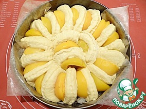 Серединку тоже заполняю тестом с персиками (у меня осталось чуть больше теста, чем было необходимо для серединки, поэтому в дальнейшем она поднялась выше краев).