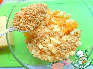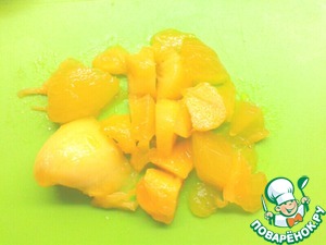 Нам понадобится только половина мякоти. Измельчаем её до величины тёмной фасоли. Остальное можно скушать.
