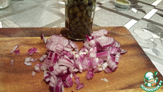Нарезать красный лук и добавить каперсы.