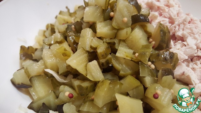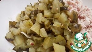 Нарезать маринованный огурец.