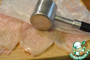 Грудку назрежем на три отбивные. Прикроем целофанкой и немножко