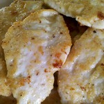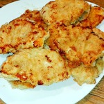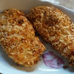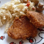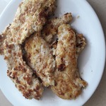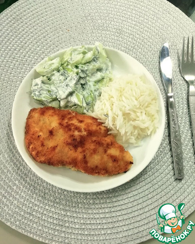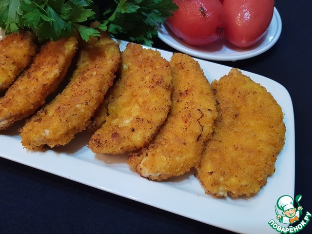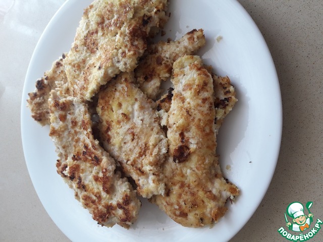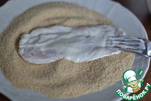 Подцепили вилкой одну отбивную в йогурте и перенесли ее на сухари.
