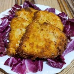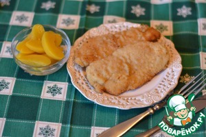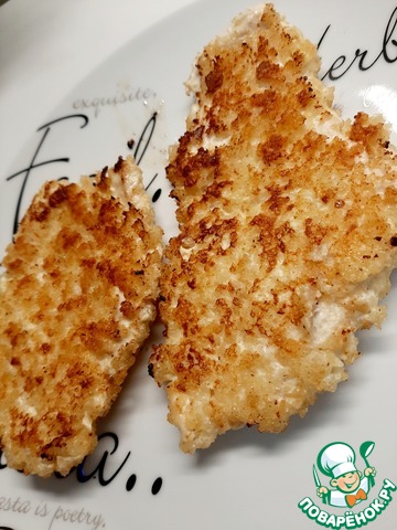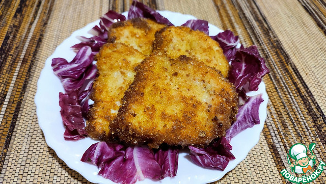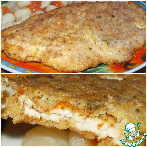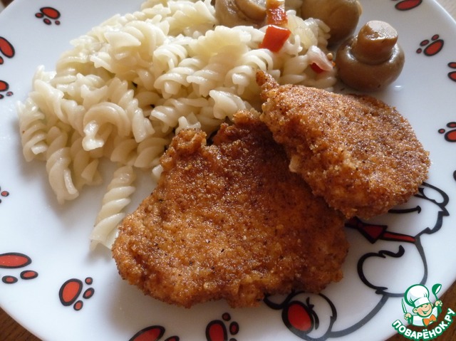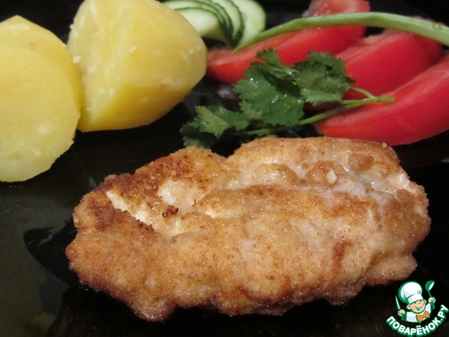 Так же вилкой аккуратно перевернули отбивную, положили другой стороной на сухари. Я даже немножко вилкой "притоптала" сухари на мясе.