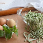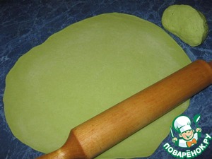 Всю зелень - укроп, петрушку, сельдерей, кинзу, зеленый базилик помыть и положить в миску. Залить водой и пробить блендером, процедить через сито 2 раза. На процеженной зеленой воде замешиваем тесто с добавлением яйца, соли и просеянной муки. Убрать в пакет на 30 минут, теперь можно начинать раскатывать тесто!