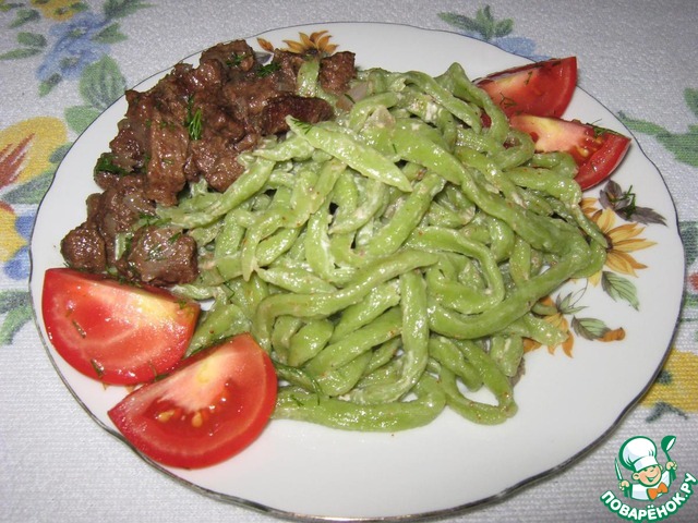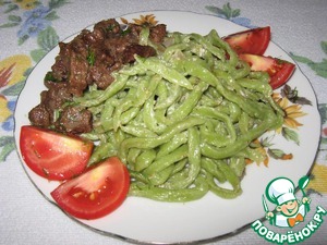 Я нарезала лапшу, отварила, сдобрила ее соусом из майонеза с чесночком и черным перцем и подала как гарнир к мясу. Вкусно!!!