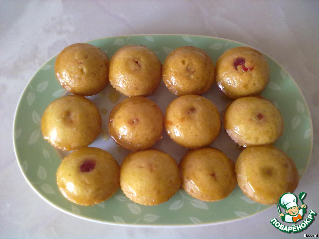 Еще теплые маффины достать из формы и обильно полить сиропом. Лучше всего прямо опускать теплый кекс в сироп и окунать его со всех сторон, а затем выкладывать на блюдо.