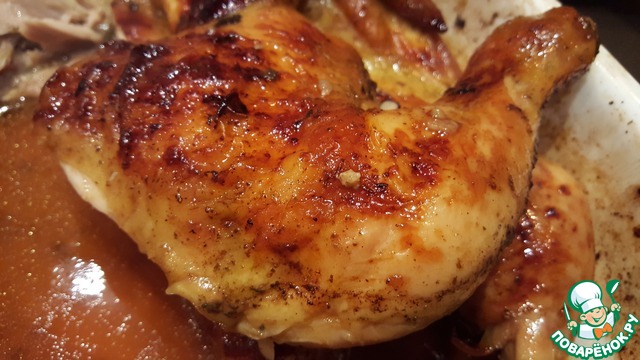 2)хрустящей корочки тут не ждите,курица за час пропитывается соусом и когда перевернете она не особо подсыхает,у меня достаточно быстро стала подгорать,хотя все делала точно по рецепту и с духовкой все прекрасно.В итоге кожа получилась тонкая и влажная,сухой румяной корочки нет
