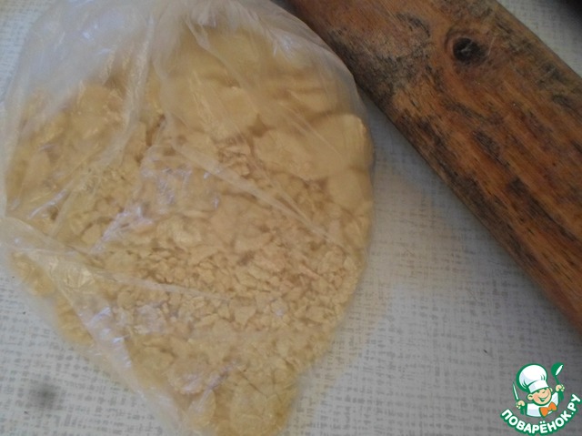 Хлопья кладем в пакет, завязываем и разминаем скалкой.
