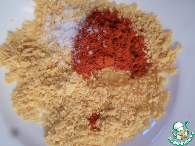 К хлопьям добавляем паприку, соль и масло. Тщательно перемешиваем.