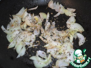 Готовим соус. Лук нарезаем полукольцами, выкладываем в сковороду разогретую с маслом вместе с прованскими травами, обжариваем 2 минуты.