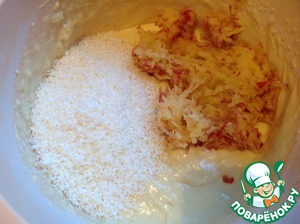 Всыпать кокосовую стружку и яблоко натертое на средней терке вместе с кожурой.