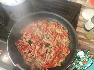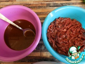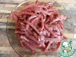 Порезать говядину на тонкие полоски против волокон (я не ошиблась, именно против, как бы взъерошив мясо). Мясо не солить!!!