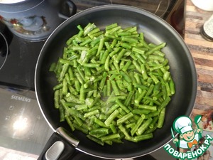 Немного оливкового масла на сковороду, хорошо нагреть и обжарить фасоль 5-6 минут, совсем чуть-чуть присолить. Обжарку делаем в один ряд, если не помещается в сковороду - делаем в два захода
