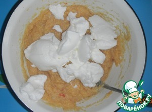 Белки достаем из холодильника, взбиваем до устойчивых пиков и аккуратно вымешиваем ложкой с основной массой.