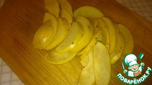 • Айву хорошо промыть. Разрезать пополам. Удалить сердцевину и порезать дольками.