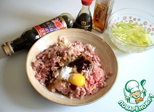 К фаршу добавить креветки натертый на терке чеснок и имбирь, кунжутное масло, соевый и устричный соусы, рисовое вино, кукурузный крахмал, яйцо. Посолить только осторожно, уже был добавлен соевый соус. Хорошо перемешайте, фарш обязательно выбить и дать настояться.