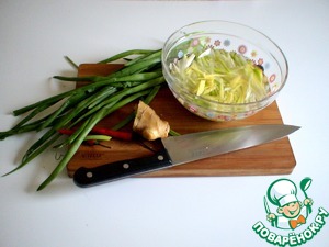 Зелёный лук (белую часть) нарезать вдоль, имбирь тонкой соломкой, после чего залить холодной водой и оставить минимум на 20 минут. Слить воду.