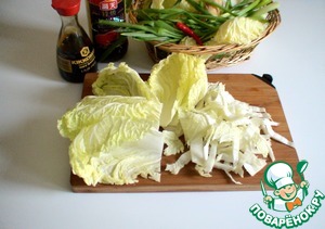 Пекинскую капусту разделить на листья и каждый листочек разрезать поперёк на две части. Верхнюю зелёную часть листьев оставить, как есть, а нижнюю, более грубую, нарезать на полоски шириной, примерно в три сантиметра.