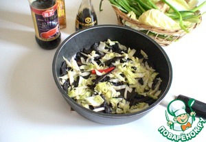 В сотейнике разогреть масло, обжарить грибы, добавить нижнюю часть пекинской капусты белую часть лука с имбирём еще немного обжарит. Затем добавить соевый и устричный соусы, рисовое вино, 5специй. Посолить