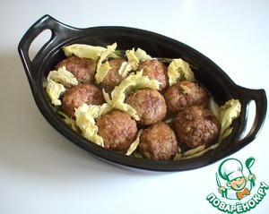 Выложить в сотейник мясные шарики, перекладывая их зелёными частями пекинской капусты.