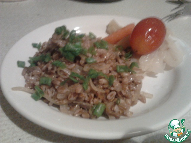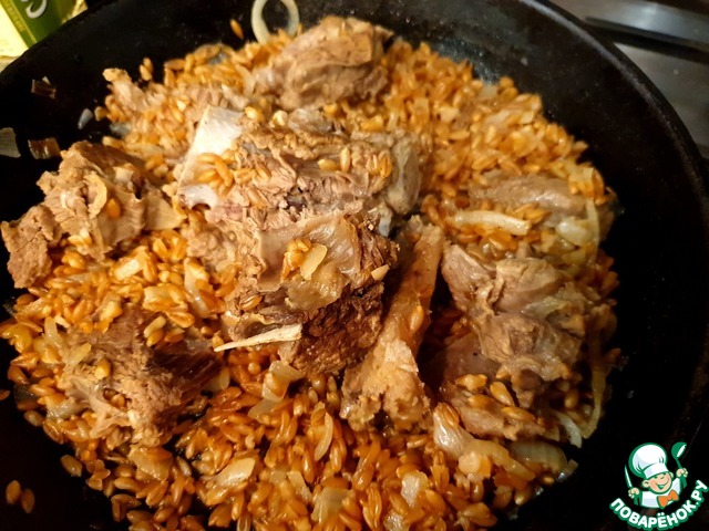 К готовой крупе добавить баранину, жареный лук. Попробовать на вкус, если надо, досолить и поперчить. Протомить все на маленьком огне минут 10, после чего можно все перемешать и подавать на стол. В оригинале, мясо с кашей не перемешивают, а кладут в тарелке сверху. Но мне больше нравится все смешать.