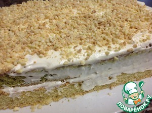 Наносим взбитый крем, чередуя коржи по цвету. Посыпать орехами через корж.
