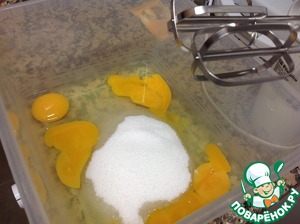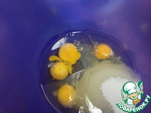 Теперь займёмся бисквитом. 4 яйца взбить миксером со стаканом сахара до густой пены.