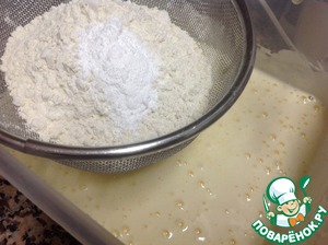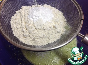 Просеять 2 стакана муки с пакетиком разрыхлителя