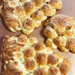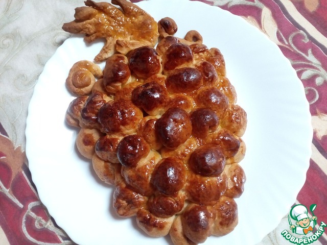 Тесто через 4 часа вынуть из холодильника, дать немного согреться. Раскатать из части теста жгуты, нарезать на кусочки размером с фундук, расплющить пальцами лепёшки, положить в них изюм по 2 - 3 штучки, защипать края, скатать шарик, выложить шарики в виде виноградной грозди. Сделать из теста листочки и усики. Расстоять пирог 20-25 минут. Выпекать при 190 градусах 30-35 минут. В духовке хрущёвское тесто очень хорошо поднимается. Раствором из чая и меда смазать пирог, печь еще минут 5, ориентируясь по своей духовке.