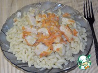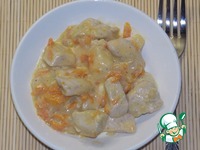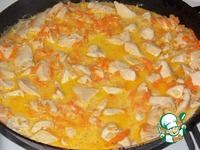 К филе добавляем лук с морковкой, всё заливаем соусом. При необходимости добавить воды. Тушить на самом маленьком огне минут 20. |