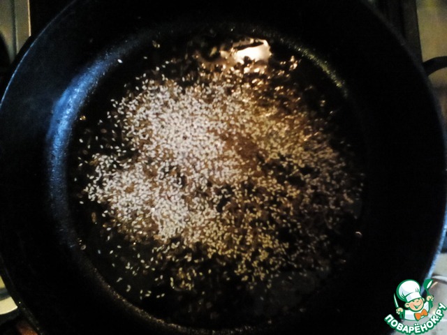В сковороду налить масло, добавить зиру, кунжут и семена укропа (если каких-то специй нет- не страшно). Проколить сковороду с содержимым.