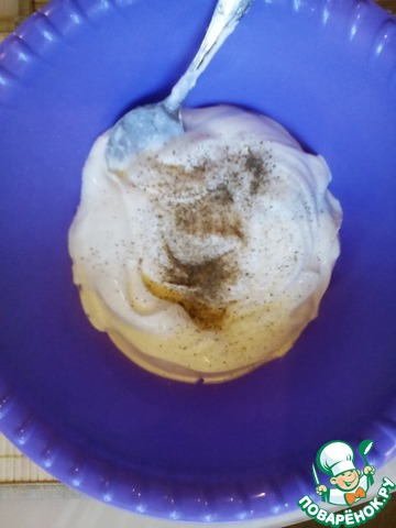 Приготовим соус: сметану смешать с солью и перцем. Если сметана слишком густая, можно добавить чуть молочка.