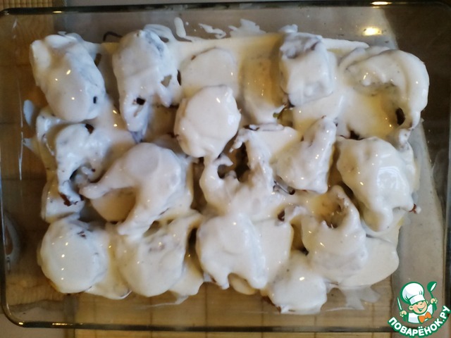 Покрыть картошку с рыбой соусом.