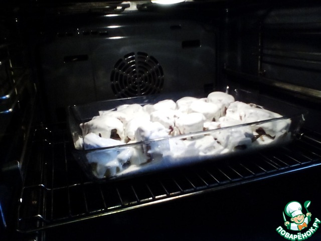 Вынуть блюдо и посыпать его, натертым на мелкой тёрке, сыром. Отправить в духовку на 3 минуты, что бы сыр расплавился.