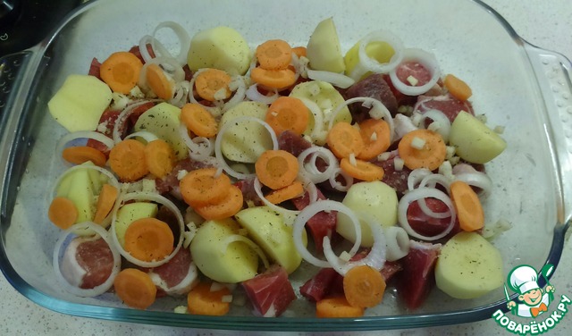 Картофель режем пополам, морковь колечками, лук кольцами, чеснок на небольшие дольки. И отправляем овощи к мясу. Поливаем оливковым маслом. Солим, перчим и добавляем специи на свой вкус. Если делаю с адыгейской солью, то специи не кладу, потому что она уже содержит специи и очень ароматная. Если с обычной солью, то орегано, мускатный орех, хмели сумели.