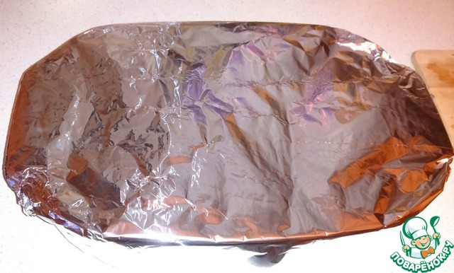 Накрываем фольгой и отправляем в разогретую до 180 градусов духовку примерно минут на 45-50.