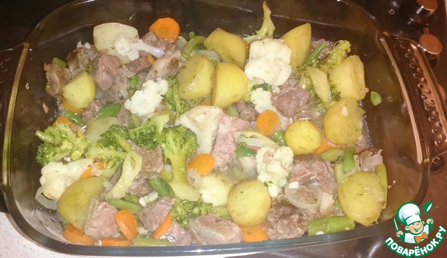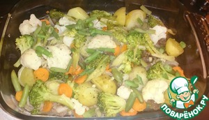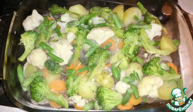 Затем достаем, добавляем фасоль, цветную капусту и брокколи. Солим, накрываем фольгой и опять отправляем в духовку минут на 15.