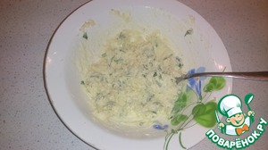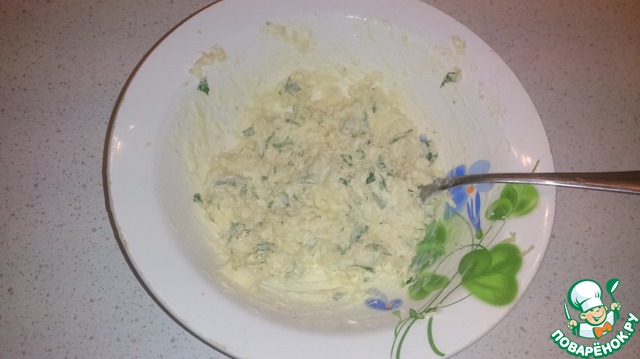 Делаем чесночное масло. Для этого смешиваем масло, сыр, сметану, чеснок, зелень. Солим, перчим.