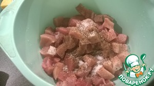 Мясо нарезать на небольшие кусочки размером 1,5 на 1,5 см. Посолить, поперчить.