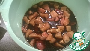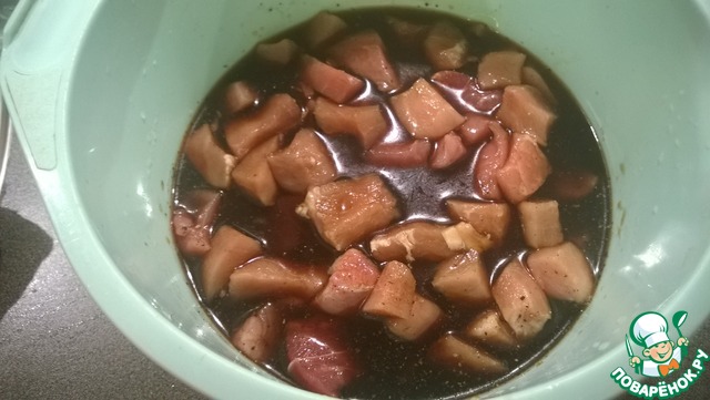 Залить мясо соевым соусом отправить в холодильник на 30 мин.