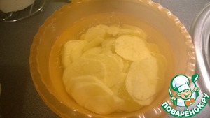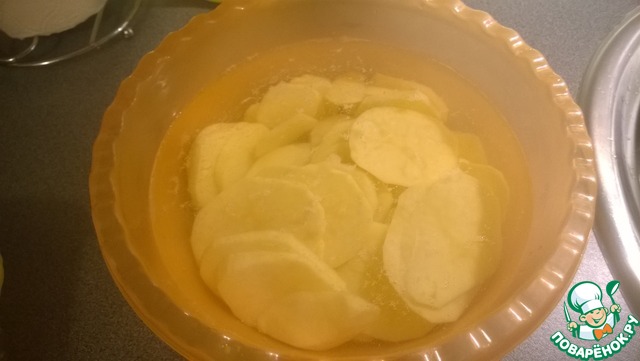 Картофель очистить и нарезать кружочками толщиной 0,5 см. Посолить и залить водой. Поставить в холодильник на 20 мин. Затем слить воду и поставить в микроволновку минут на 3-4 (в зависимости от мощности вашей микроволновки). Это для того, чтобы картофель успел пропечься.