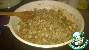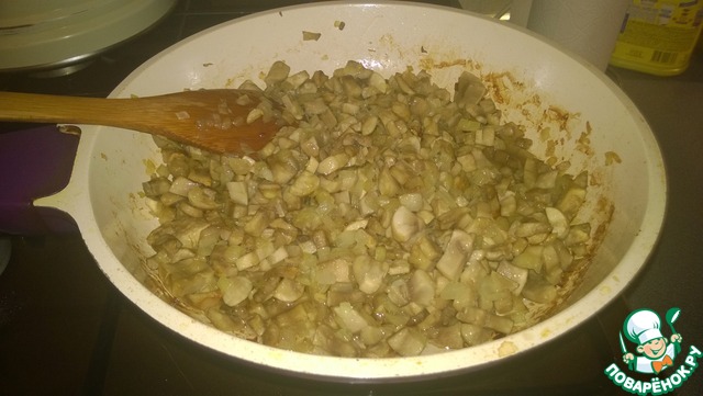 Грибы нарезать средними кусочками, лук мелко и поставить на огонь. Жарить до полу-готовности.