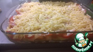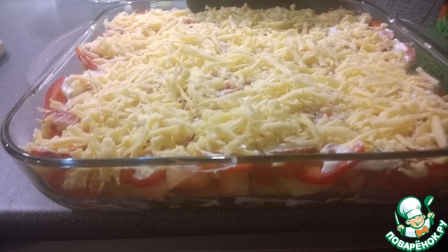 Слить соус из мяса. И укладываем все в форму для запекания смазанную растительным маслом слоями: 1 - мясо, 2 - грибы с луком, смазать немного майонезом, 3 - картофель, 4 - помидоры, 5 - перец болгарский, смазать майонезом и посыпать сверху сыром.